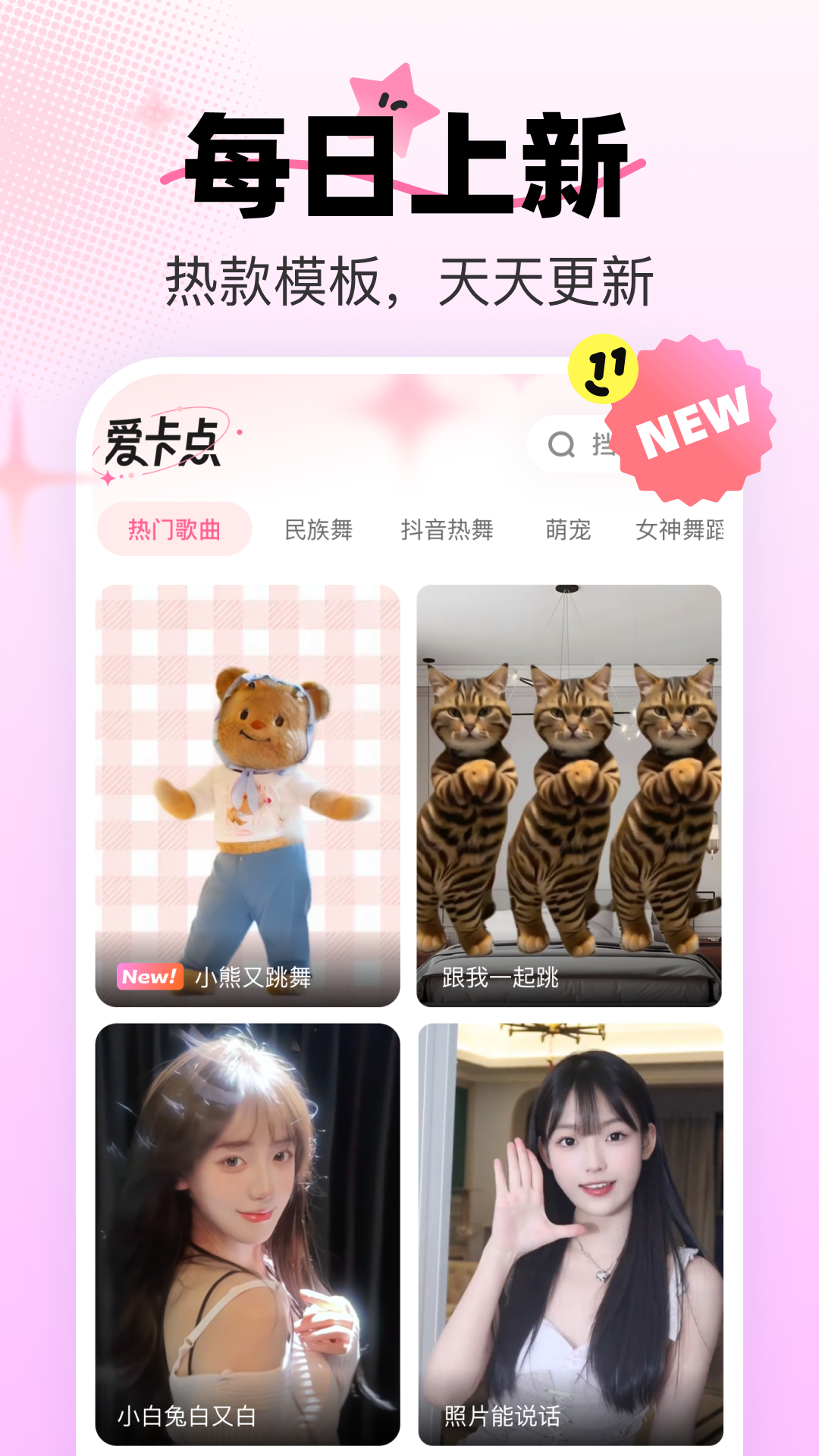 爱卡点app,只需上传一张照片,即可制作跳舞视频。 照片跳舞: 超火的奶牛猫跳舞,上传宠物照片一键制作,多种时尚舞蹈提供选择,搭配流行歌曲,每日更新,紧跟潮流。 素材广场: 提供下载和查看超多热门素材,古画唱歌,小和尚禅语,图片滤镜等 抠图换背景: 上传照片智能抠图,傻瓜式操作,废片救星!